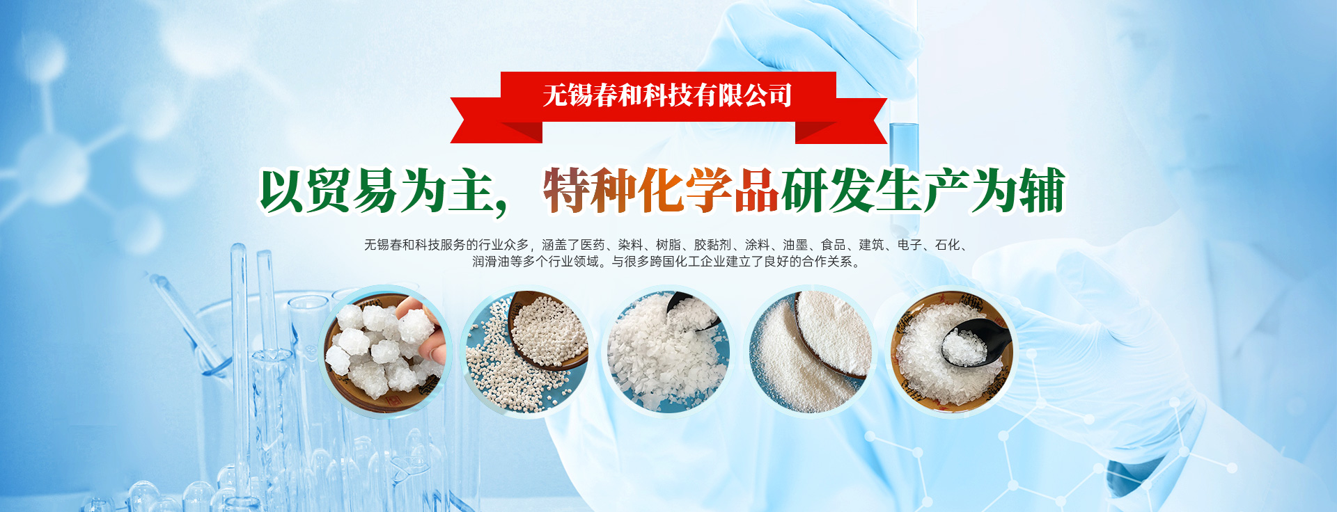 无锡春和科技有限公司,自2019年成立以来,一直致力于成为化工原材料供应商,以贸易为主,特种化学品研发生产为辅的工贸一体化综合性企业,通过提供产品,良好的客户服务,公司发展迅速,赢得了客户的认同与信任。服务的行业众多,涵盖了医药、染料、树脂、胶黏剂、涂料、油墨、食品、建筑、电子、石化、润滑油等多个行业领域。与很多跨国化工企业建立了良好的合作关系。我们为客户提供优质的服务,一直坚持“客户至上、诚实守信”的经营宗旨, “与客户一起赢得未来”是我们的奋斗目标。